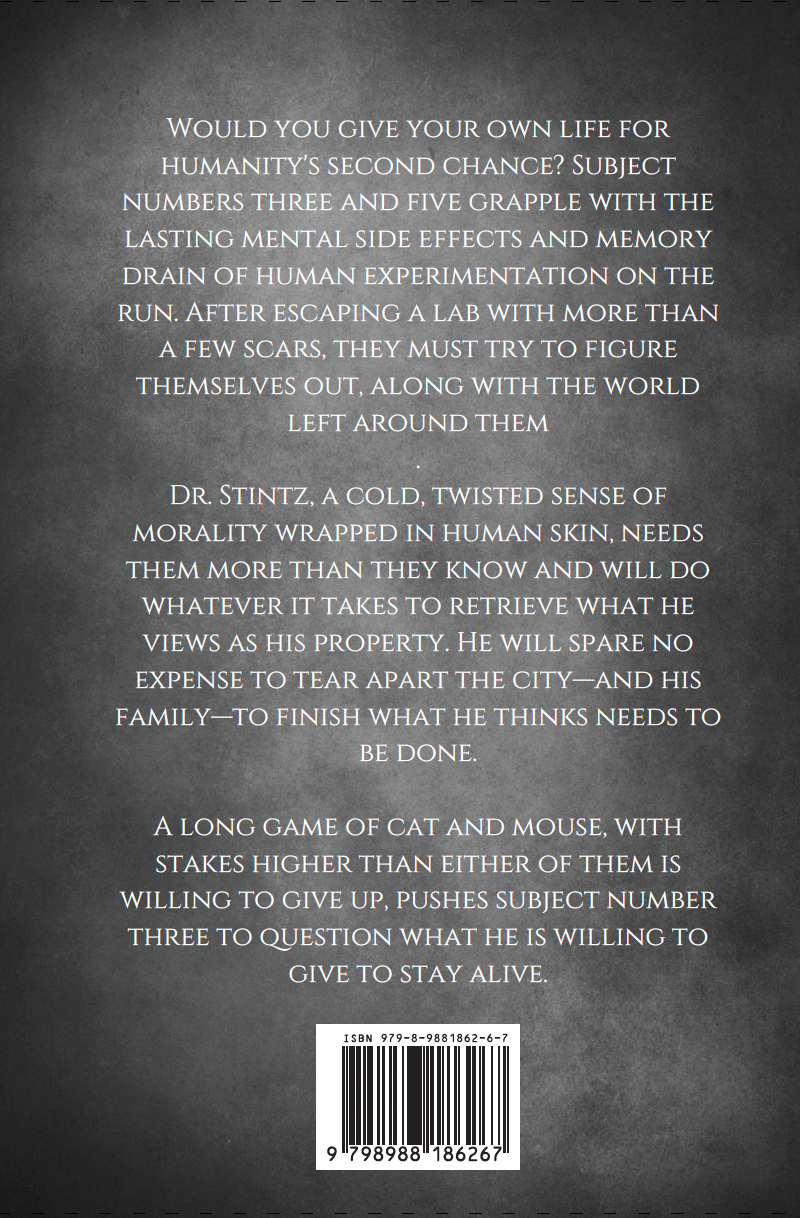 Subject numbers three and five grapple with the lasting mental side effects and memory drain of human experimentation on the run. After escaping a lab with more than a few scars, they must try to figure themselves out, along with the world left around them.